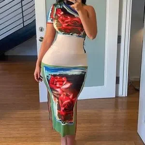 Work of art. The Pari Set features a fitted, one shoulder, floral printed throughout, crop top. The matching bottom is at midi length and features a pull on closure.