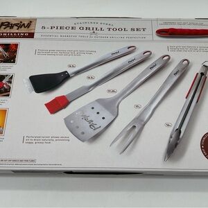 The Parini 5-Piece Grill Tool Set is a modern BBQ tool set designed for outdoor cooking enthusiasts. This set includes five stainless steel tools with a silver color, making it both durable and stylish. The set includes a grill set with easy clean features, making it convenient for use and maintenance. Each tool in the set is made with stainless steel handles for a comfortable grip while grilling. Perfect for any backyard chef looking to upgrade their outdoor cooking experience.