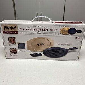 Enhance your cooking with the Parini Black Fajita Skillet Set. This set includes a heat-retentive skillet, wooden trivet, and hot mitt, perfect for sizzling fajitas.