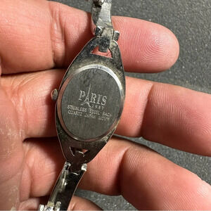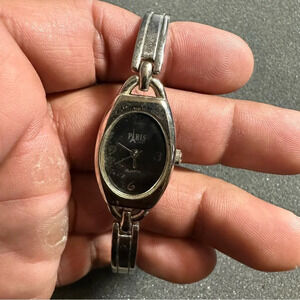 Paris 1937 Ladies Quartz Fashion Watch Silver Tone Black Dial Working shows signs of wear such as scratches on case band and crystal as well as some tarnishing see pictures for reference