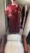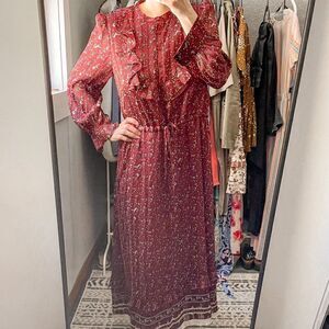 Features: long sleeve, button up front closure, ruffle neckline, drawstring waist, loose oversized fit, satin fabric, lined, maroon red with white pattern