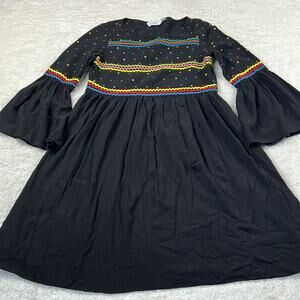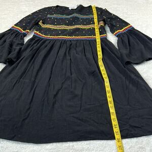 Black dress with bell ruffle cuffs, ric rac and polka dot pattern, and crew neck. Dress has hidden side zipper, no pockets, and not much for stretch.