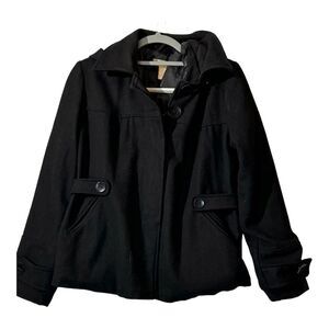 Keywords: Anthropologie, pea coat, wool blend, women's coat, black coat, button closure, fall fashion, casual wear, long sleeve, pre-owned, size large, classic fit, short length, solid pattern, polyester lining.