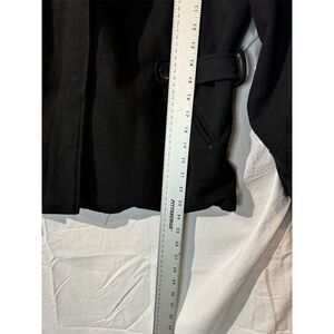 This pea coat is designed for women and comes in a size large. It features a classic fit with a short length, crafted from a wool blend outer shell and lined with polyester. The coat is solid black with a button closure and two front pockets, making it suitable for casual occasions in the fall season. It has long sleeves and is not vintage. The coat is pre-owned.