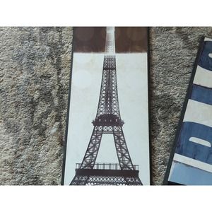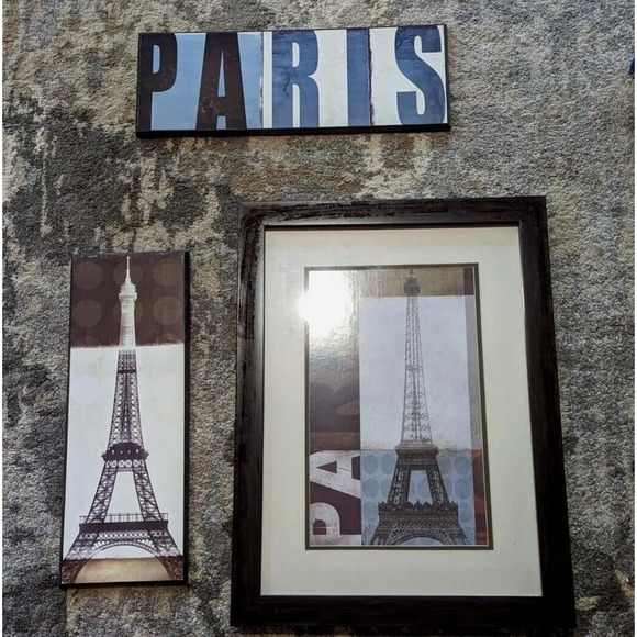This 3 piece lot of Paris decorations is perfect for adding a touch of France to your home decor. The set includes a framed picture measuring 23.5\" x 17.5\" and two wooden pieces measuring 18.5\" x 6.5\". The brand of the items is Wooden and the dimensions are: Item Height 23 in, Item Length 17 in, and Item Width Less Than 5 in.