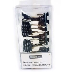 12 Resin Shower Curtain Hooks. Hooks are silver colored and the base of the piece is Resin in a Blackish Grey.
