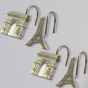 Paris Eiffel Tower Arc de Triomphe French Shower Hooks Set of 12 White Gold Silver Tone Metal Hooks