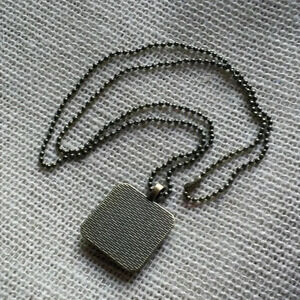 Handmade square glass cabochon pendant necklace in antiqued brass setting and 27" long ball chain