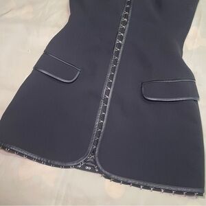 Made from recycled suiting fabric with faux leather trim, the Shana Mini Dress from Paris Georgia is a unique statement piece. Its strapless silhouette features a hook and eye detail down the center for adjustable coverage, as well as flap pockets at the hips for added practicality. Create the perfect look with this stylish and sustainable piece.