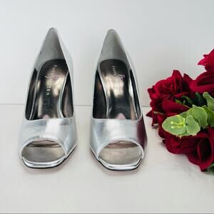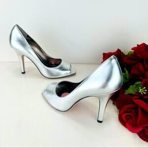 🪲 Paris Hilton Glitzy Stiletto Pump Size 6.5 Silver Metallic Leather Open/Peep Toe Padded Footbed New
