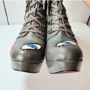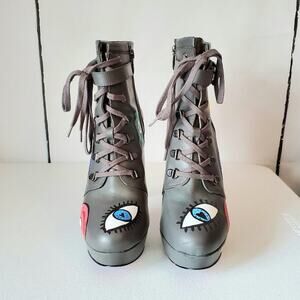 EUC: Distressed Art In Motion, "Trinity" grey leather upper ankle boots with one of a kind- hand painted & signed art deco by Aja/side zip closure/lace up & belt buckle accent/synthetic sole/stiletto heel/almond toe by Paris Hilton. In fashionista chic condition with working zippers/intact seams. **Disclosure: there are nicks on both heels/scuff & paint marks/tread wear & color repair to the soles/interior peeling spots. Please see pictures.