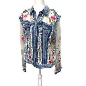 Distressed but dressed to impress. Denim look that you need to stand out. Distressed denim body and sheer mesh sleeves adorned with vibrant floral embroidery create a unique blend of edgy and feminine styles. Button closures and classic chest pockets add practicality, while intricate details elevate any outfit.