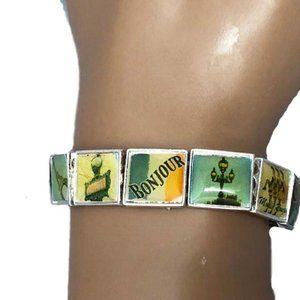 Bracelet constructed using various tiles with images of Paris theme icons. The tiles appear to be framed. Metal stretchable bracelet. Measures 7 inches.