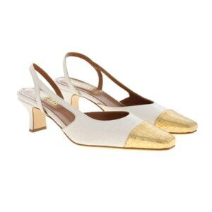 Leather slingback Color: white Gold toe Crocodile-print Covered heel Leather sole