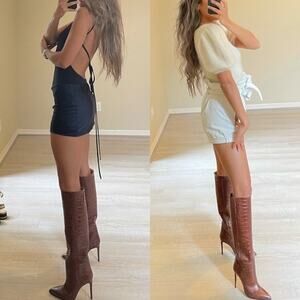 Paris Texas Stiletto Pointed Knee-High Brown Croc-Embossed Leather Heeled Boots. As seen on Emily Ratajkowski and Olivia Culpo. All photos except for modeled shots are of the actual item. Size EU 39. Excellent condition, protective film still on soles. Measurements (approximate): heel 4.25", boot shaft 16.5". This style currently retails for $1050.