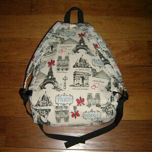 Stylish backpack with Paris-themed print. Features Eiffel Tower and 'Bonjour' design. Perfect for travel or daily use. This was used one time and is in excellent condition. The size is approximately 15"x14"x 4". There are no show zippers and one front pocket and the large main compartment. Please view the photos for details. Smoke and pet free home.