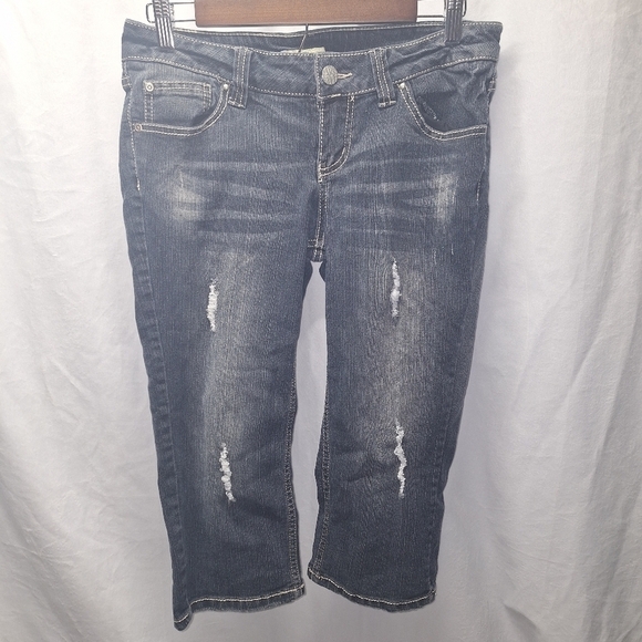 Paris blues distressed jean capris size 11 side to side measurements is 16" rise is 8" top of waist to bottom hem is 27" inseam is 18" if you have any questions please message me bundle more items for bigger deals Bin-99