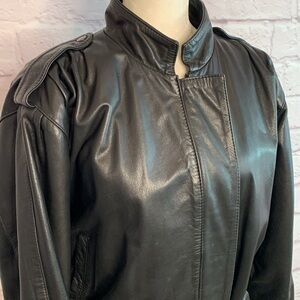 Paris-Dakar Vintage 1980s leather bomber/racing jacket. French designed genuine leather jacket, very thick and soft. Classic 80s details- broad pleated shoulder with epaulets, belted and gathered waist, big, roomy sleeves. Fully lined. Very slight wear, due to age. Size tag says 34, and based on French sizing, it should be a US size 2. I think it fits bigger, more like an 8. Mannequin is a size 4-6. Great used condition.