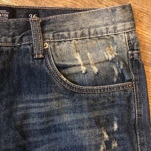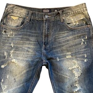 Parish Nation Factory Destroyed Distressed Jeans. Relaxed fit. Straight leg. Even has some pen ink on them ( shown in pictures). they have been washed a few times so they will not bleed