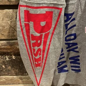 Parish Nation crewneck hoodie. All over print on the front of the hoodie. Patch on left arm. Drawstring hood. No hand pocket. Gently used preowned condition, see photos. Some cracking of the screen printed graphics.