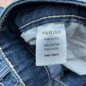 These Parish Nation Jeans for men in size 36 feature a unique blue camo patch design and a 2006 stonewash distressed bootcut style, made from solid cotton material.