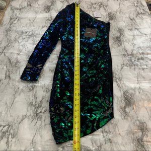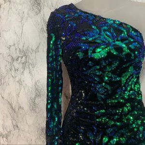 Parisian Sequin Blue Green One Sleeve Dress size 2