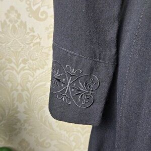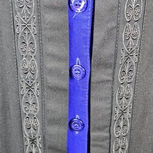 This coat dress has multiple pieces of fabric seamed together for a slimming A-line silhouette. Black with a bright cobalt blue center button placket and interior collar. Faux flap pockets on the front. Long sleeves. Mandarin collar. There is black embroidery on the collar, cuffs, pocket flaps and on either side of the button placket. Beautiful in its simplicity and detail. Would look great paired with tall black boots.
