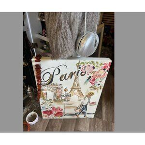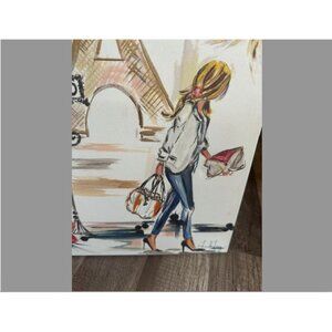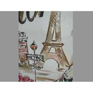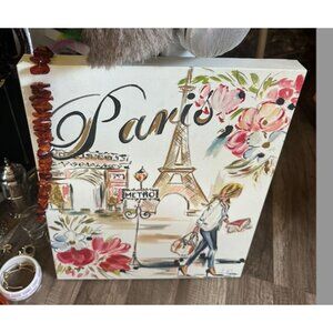 Elevate your space with this Parisian street scene canvas wall art. Features a chic lady, Eiffel Tower, and vibrant flowers.