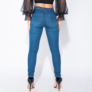 Parisian High Waist Ripped Distressed Skinny Denim Jeggings. NWOT, US size 8, Inside tag says size 12 but that is UK size, runs small see measurements, denim is darker than the picture shows. Measures 28" waist, 27" inseam. Machine washable cold water, 66% cotton, 31% polyester, 3% spandex. Button and zipper fly. Back pockets only, Some stretch, very skinny legs, 5" hem.