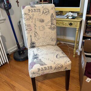 This slipcover featuring script and images from Paris and travel motif specifically fits the Dana parson's chair sold by Pier 1. It's new, in the original package, has been taking out to photograph but not used. The 2nd photo shows the slipcover on a Dana parson's chair to see what it looks like - chair not included!