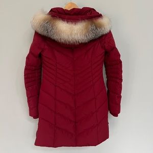 Parja quilted duck down puffer with detachable hood & fur trim, water repellent, featuring side vent zipper detail and zipper pockets and cozy rib knit storm cuffs, like new