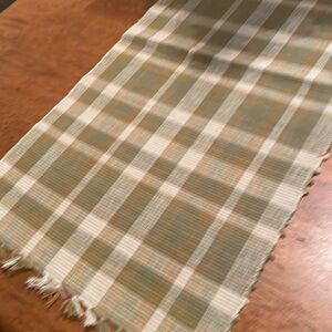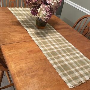 Park Designs sage, tan and off white table runner. 100% cotton, made in India. Measures 13” x 54”.