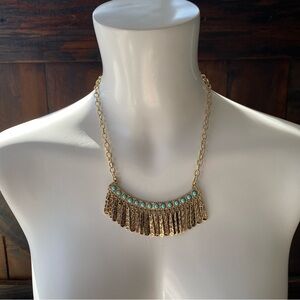 Unleash your inner goddess with the Maya Necklace, a bold statement piece designed to captivate. This layered bib-style necklace features rows of radiant hammered gold-tone fringe, accented with brilliant turquoise stones for a striking contrast. The intricate detailing and cascading design evoke a rich, exotic elegance inspired by ancient artistry.