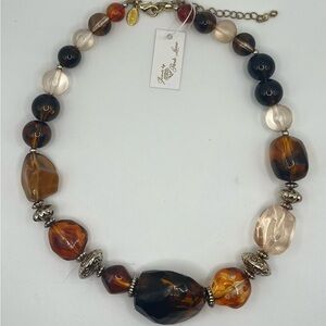 Gorgeous Park Lane statement necklace featuring an array of chunky faceted beads in warm amber, tortoise, caramel, and champagne tones. Accented with ornate silver-tone spacer beads for added texture and elegance. Adjustable gold-tone chain closure for the perfect fit.