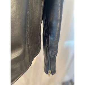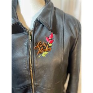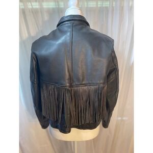 Very comfortable women's black leather biker jacket with back fringe. Harley Davidson Embroidered on left front.