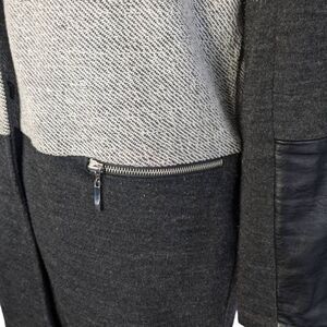 ParkHurst coat simple button down coat oversized color block light and dark gray Medium with leather accents on sleeve and neck mandarin styled collar zippered pockets full zip Gently used condition no flaws measured as flat lay in inches chest 21.5 inches length 32inches