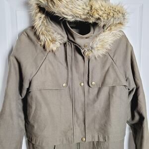 Parka Jacket Womens Large Faux Fur Removable Hood Convertible Cropped Canvas