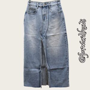 New in Bag Parke maxi skirt in soft blue denim. This skirt features five pockets, a frayed raw-edge hem, a front slit, and a button/zipper fly. Made from 100% cotton, it also includes belt loops, custom “Parke” buttons, and a Parke patch on the back.