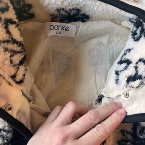 Cozy teddy jacket with a stylish floral pattern. Cream base with black flowers. Perfect for layering and staying warm.