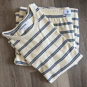 Parke x Emma and Maggie Macdonald White and Blue set. This is the short sleeve and long pant set that Maggie has on. NWT. Never worn. Comes in original packaging.