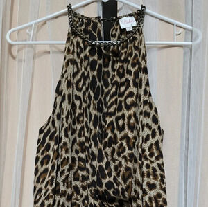 Parker 100% Silk Chain Collar Halter Mini Dress, Black & Tan Leopard Print, EUC!