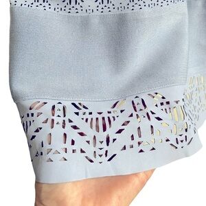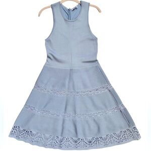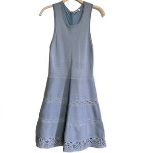 Parker “Alabama” Cute knit and laser cut leather trimmed, fit and flare light blue dress. Scoop neck, hidden back zipper, sleeveless.