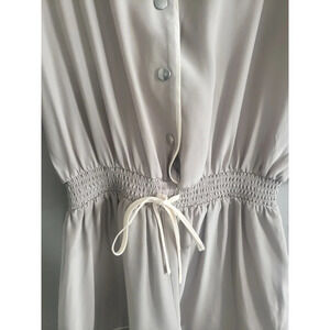 This Parker Ally Romper in Women's Medium Taupe is crafted from 100% Silk with a beautiful Satin finish. The garment features a collared neckline, 3/4 sleeves, and a button closure. The drawstring waist is adjustable for a comfortable fit and accentuates the wearer's silhouette.