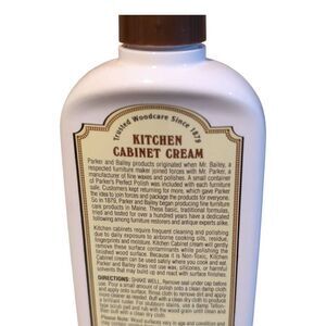 A brand new bottle of Parker & Bailey Kitchen Cabinet Cream, 8 fl oz. Still sealed. It is a multipurpose wood cleaner. Comes from a smoke-free and pet-free home.