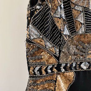One of Parker Black’s stunning beaded and sequined Art Deco-style dresses in size 2. This minidress is adorned with black, gold and silver beading and sequins.