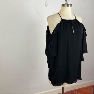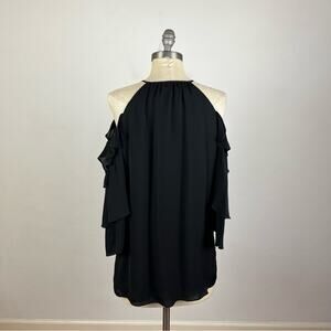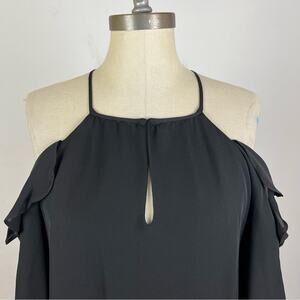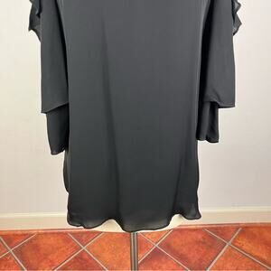 Excellent used condition. Size large. No rips or stains. Long ruffle sleeves, cold shoulder, keyhole front, 100% silk, 100% polyester lining. A8
