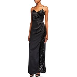 Design Details: Satin Design With Sequin Paneling, Surplice Bust, Pleated Left Waist, And Thigh Slit At Left Hem