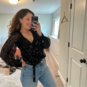 I adore this gorgeous designer Parker black golden velvet floral mesh sleeve wrap long sleeve top/blouse