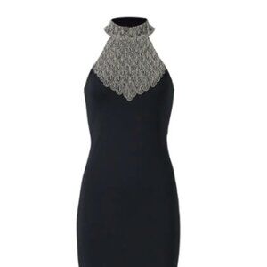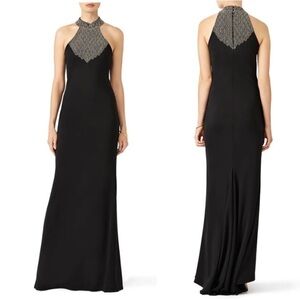 Black crepe (90% Nylon, 10% Spandex). Sleeveless. Halter neckline with beaded detail. Gown. Hidden back zipper with hook and eye closure. Fully lined. Description: