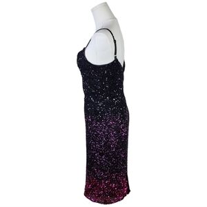 Shimmer, shine, and slay in this striking Parker Black ombré sequin cocktail dress, designed to make a bold entrance for your next night out, holiday party, or upscale event. This sleeveless bodycon dress features a sleek black-to-magenta sequin gradient, catching the light with every movement and adding instant drama and glam to your look. The deep V-neckline and low scoop back strike the perfect balance between sultry and sophisticated, while the slim silhouette flatters the figure for a confident, curve-enhancing fit.